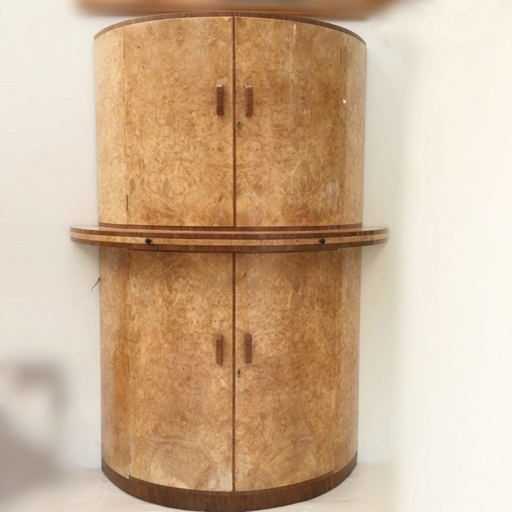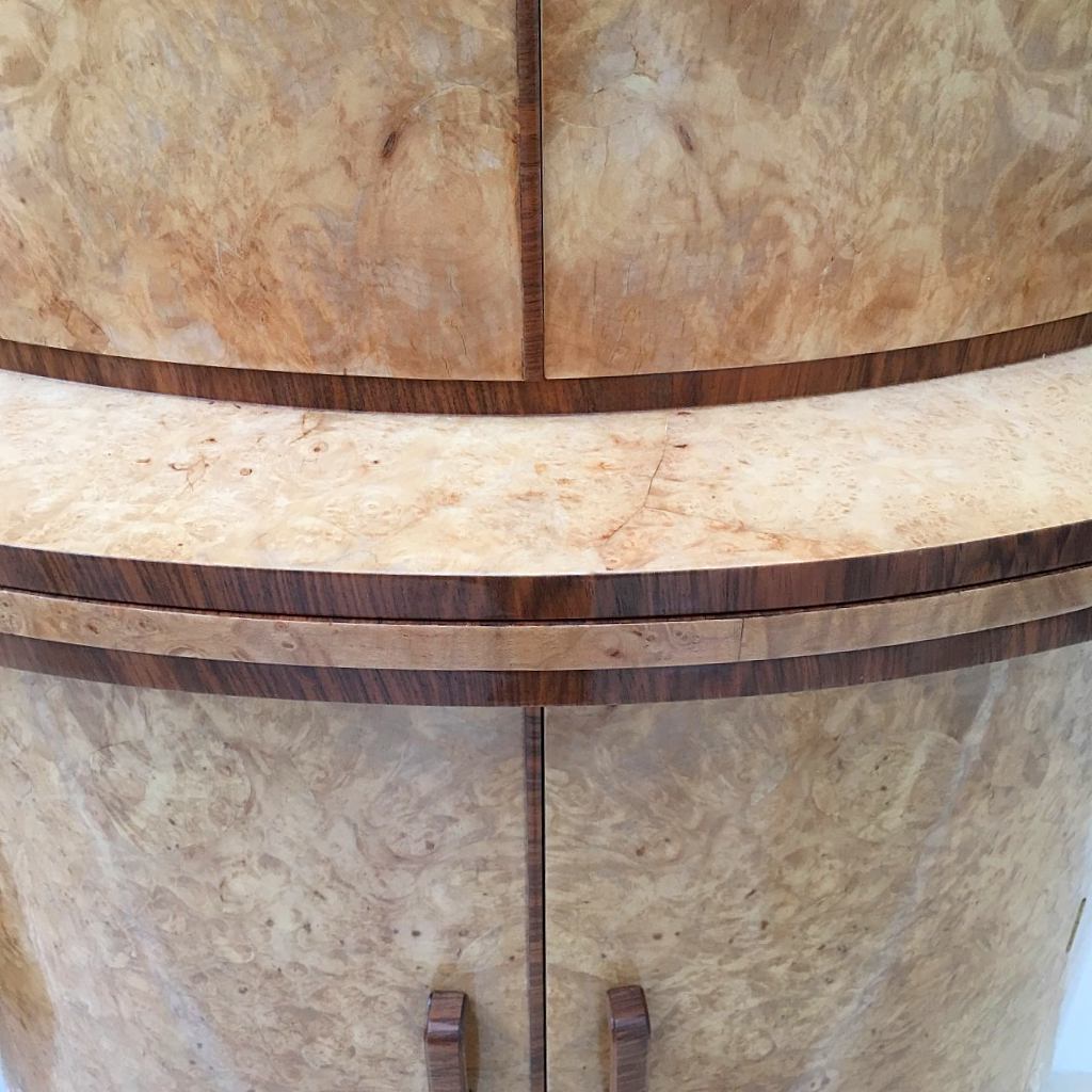 An Art Deco, demi-lune cocktail cabinet by G&F Gold Feather Products. Figured walnut with straight grain walnut banding and handles. Satin birch interior with mirrored, lit interior and integral, mirrored tray slide.