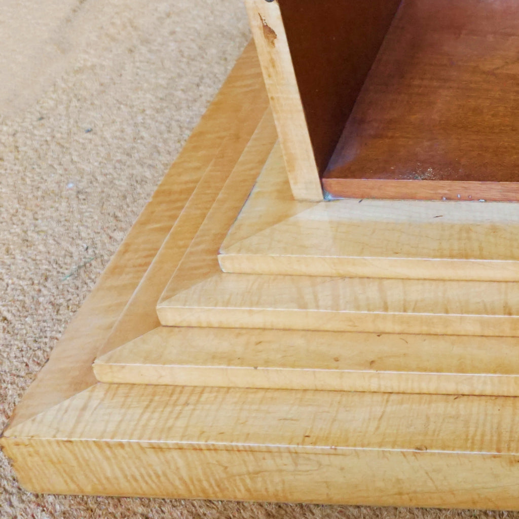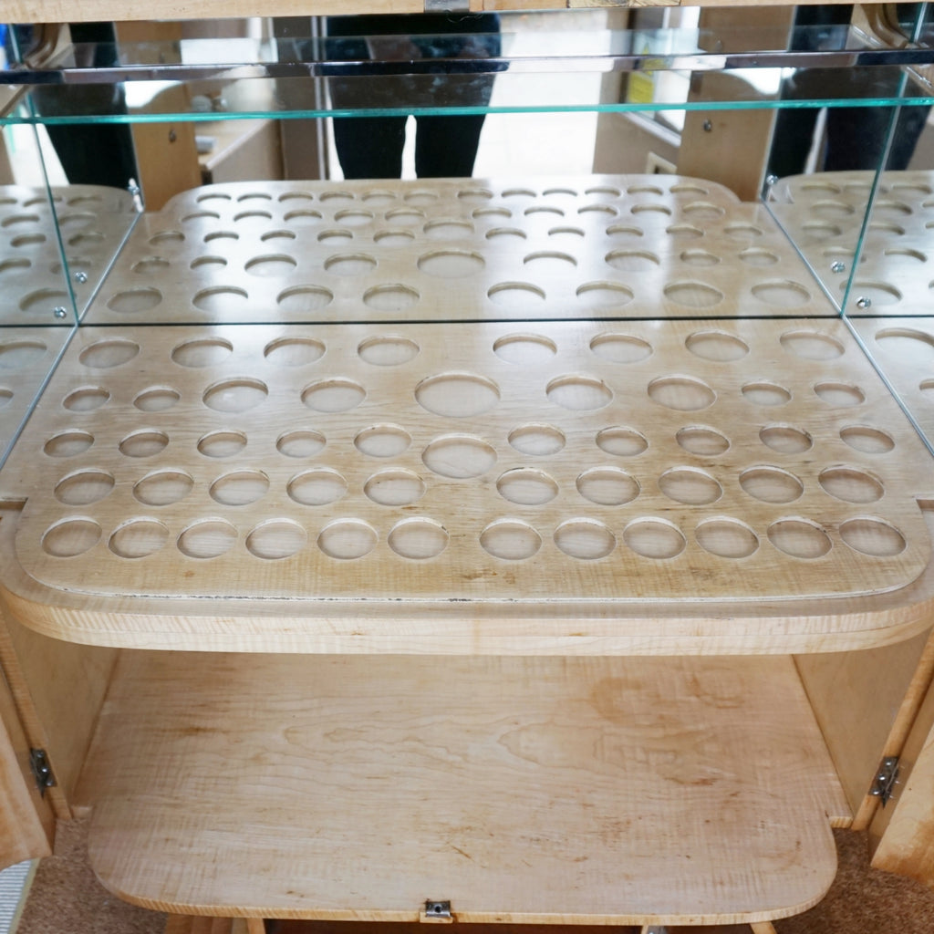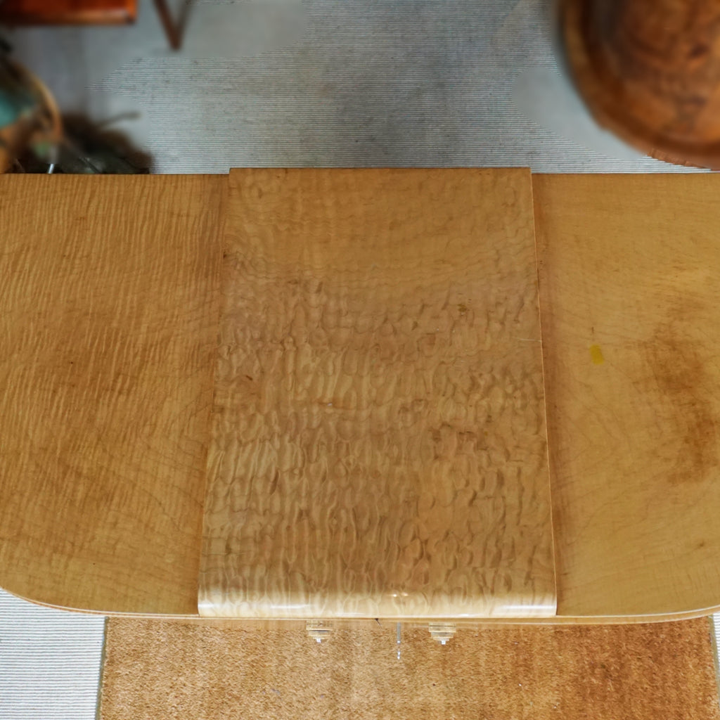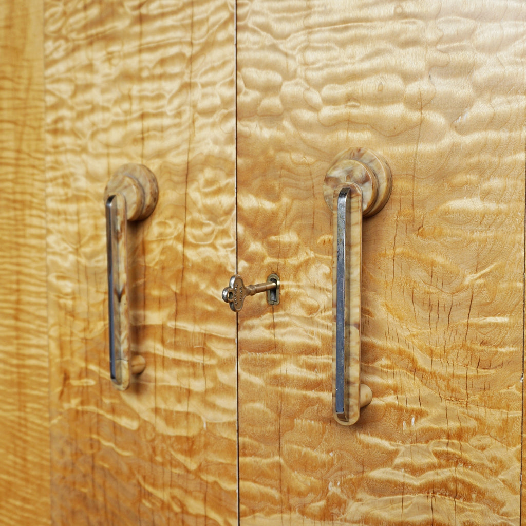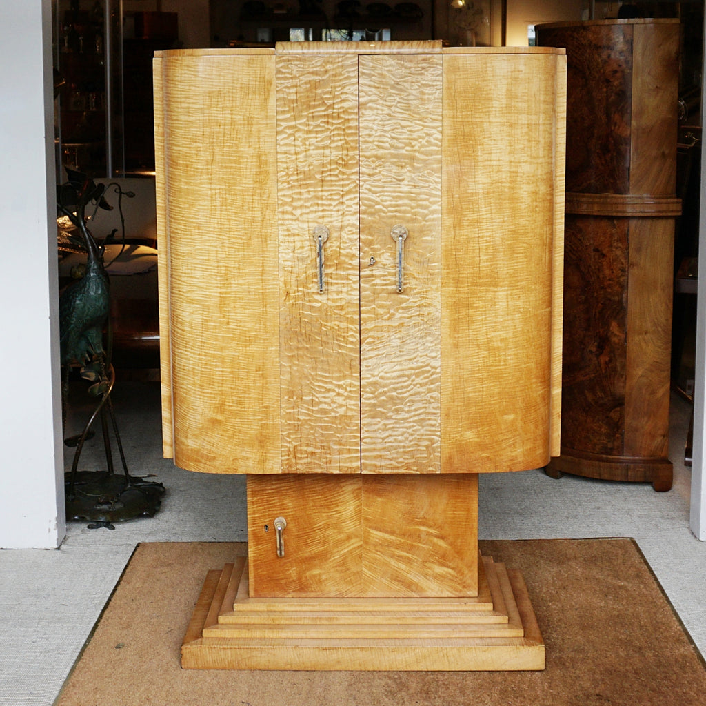 An Art Deco drinks cabinet by Hille. Satin birch veneered throughout. Upper drinks compartment opens up to reveal extensive glass storage with a small upper glass shelf. Mirrored surround interior. Lower storage compartment with graduating stepped base. Original bakelite and chrome handles.